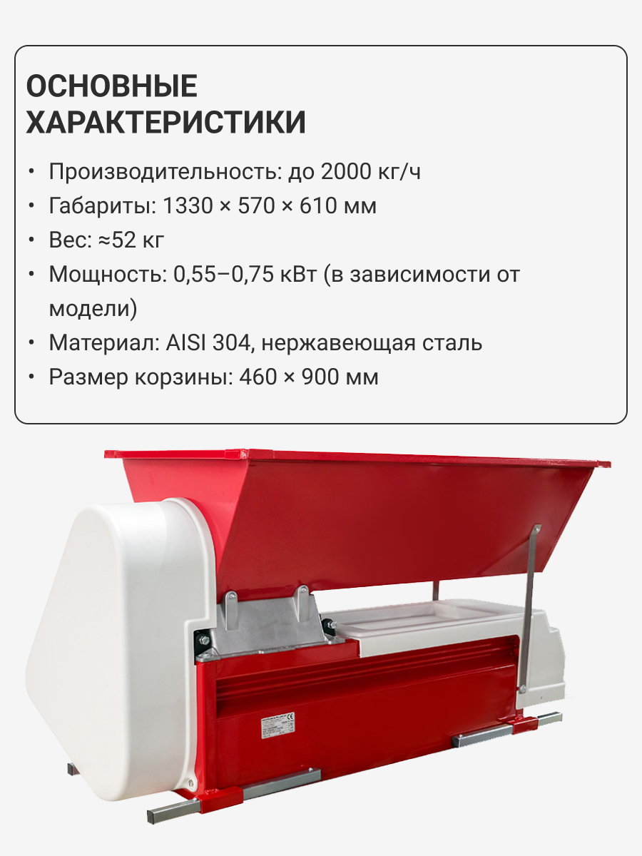 Данная дробилка позволяет экономить время и силы. Гребнеотделитель является неотъемлемым помощником для любого винодела. Измельчитель комплектуется дополнительным наборным пластиковым бункером для увеличения вместимости бункера.